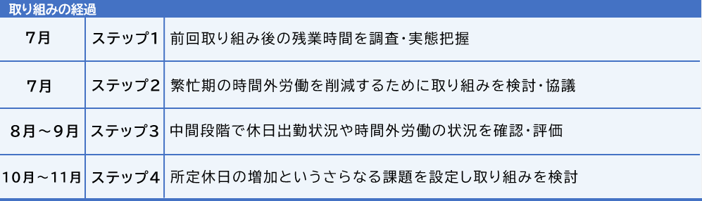 年間を通じた月々の時間外・休日労働(業務量)の差は徐々に平準化されてきてはいるが、今後さらなる平準化を目指す。具体的には、所定休日数の増加、年次有給休暇の取得促進についての取り組みを部署毎の体制にあった形で開始する。